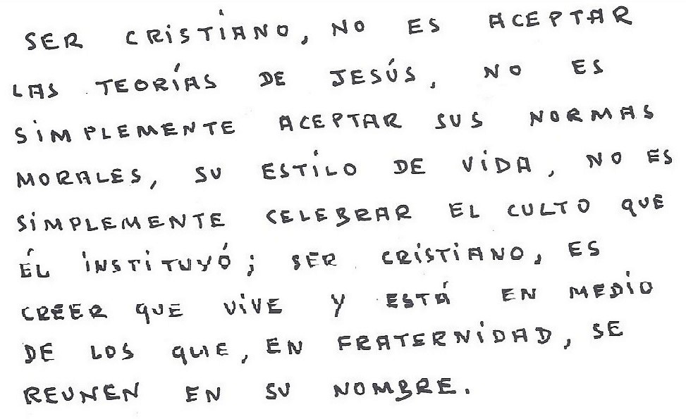 Ser cristiano, no es aceptar las teorías de Jesús, no es simplemente aceptar sus normas morales, su estilo de vida, no es simplemente celebrar el culto que él instituyó; ser cristiano, es creer que vive y está en medio de los que, en fraternidad, se reúnen en su nombre.