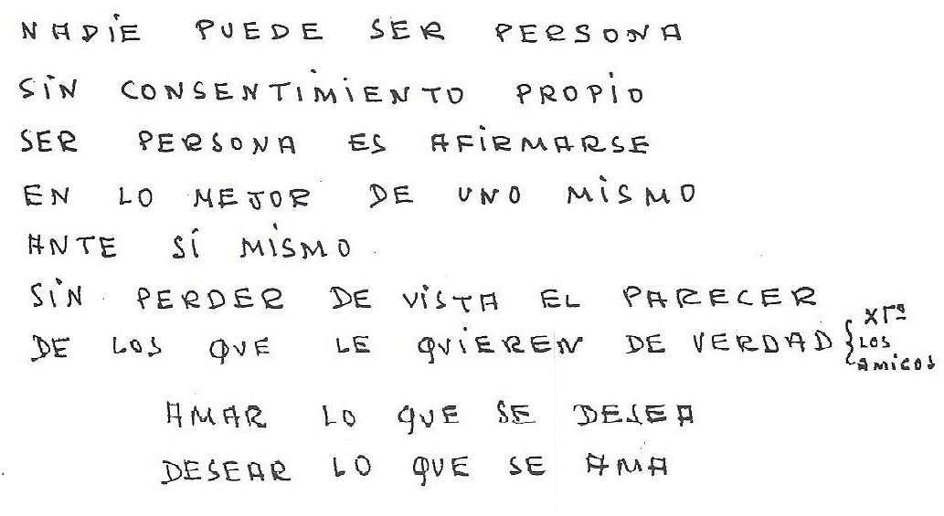 Nadie puede ser persona sin consentimiento propio. Ser persona es afirmarse en lo mejor de uno mismo, ante si mismo, sin perder de vista el parecer de los que le quieren de verdad (Cristo y los amigos).