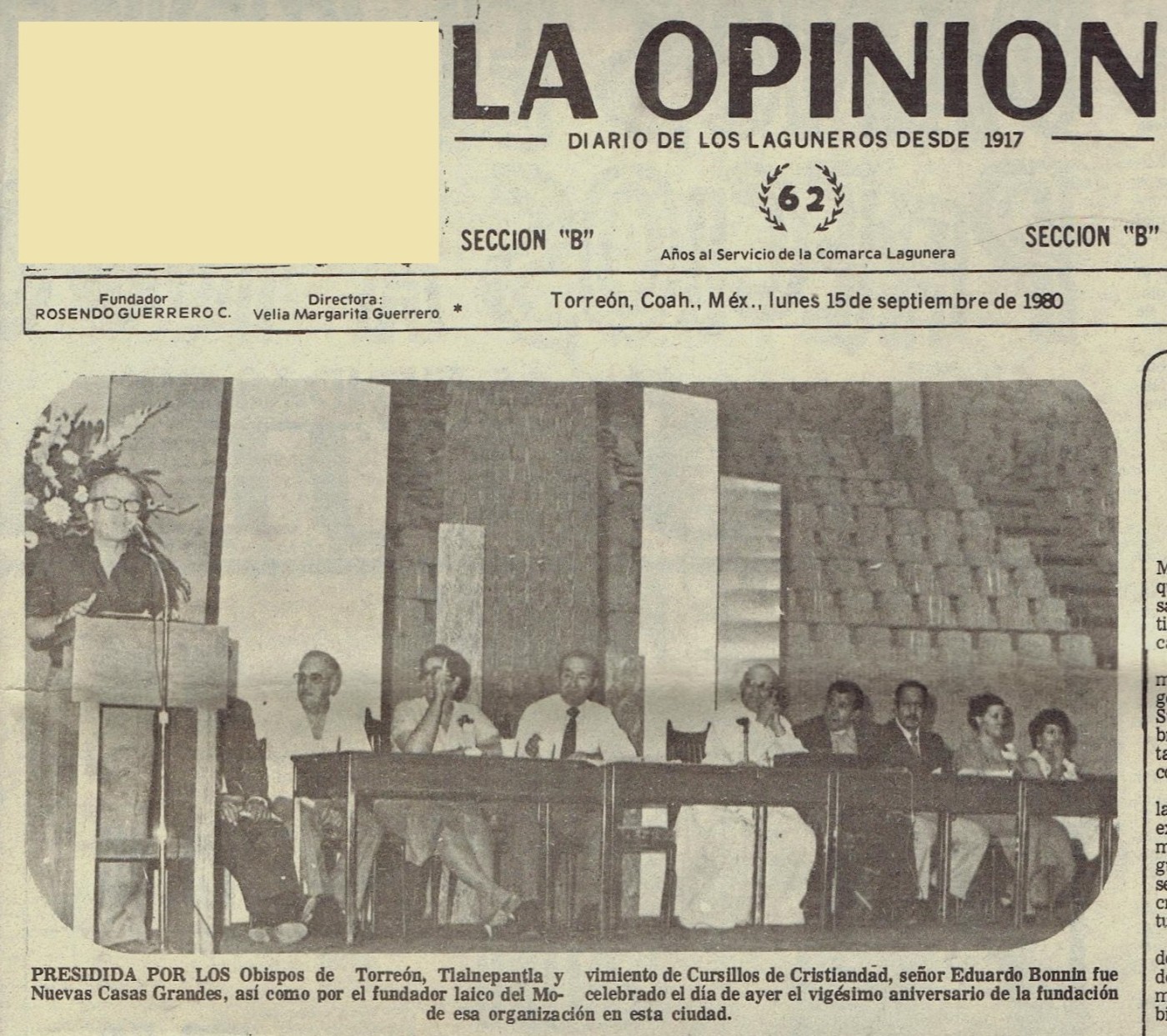 PRESIDIDA POR LOS Obispos de Torreón, Tlalnepantla y Nuevas Casas Grandes, así como por el fundador laico del Movimiento de Cursillos de Cristiandad, señor Eduardo Bonnín, fue celebrado el día de ayer el vigésimo aniversario de la fundación de esa organización en esta ciudad.