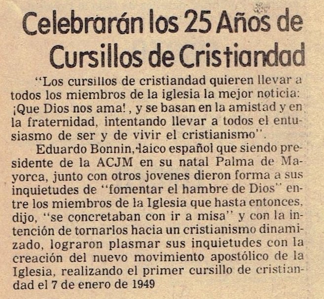 Eduardo Bonnín, laico español que siendo presidente de la ACJM en su natal Palma de Mallorca, junto con otros jóvenes dieron forma a sus inquietudes de “fomentar el hambre de Dios” entre los miembros de la Iglesia que hasta entonces, dijo, “se concretaban con ir a misa” y con la intención de tornarlos hacia un cristianismo dinamizado, lograron plasmar sus inquietudes con la creación del nuevo movimiento apostólico de la Iglesia, realizando el primer cursillo de cristiandad el 7 de enero de 1949.