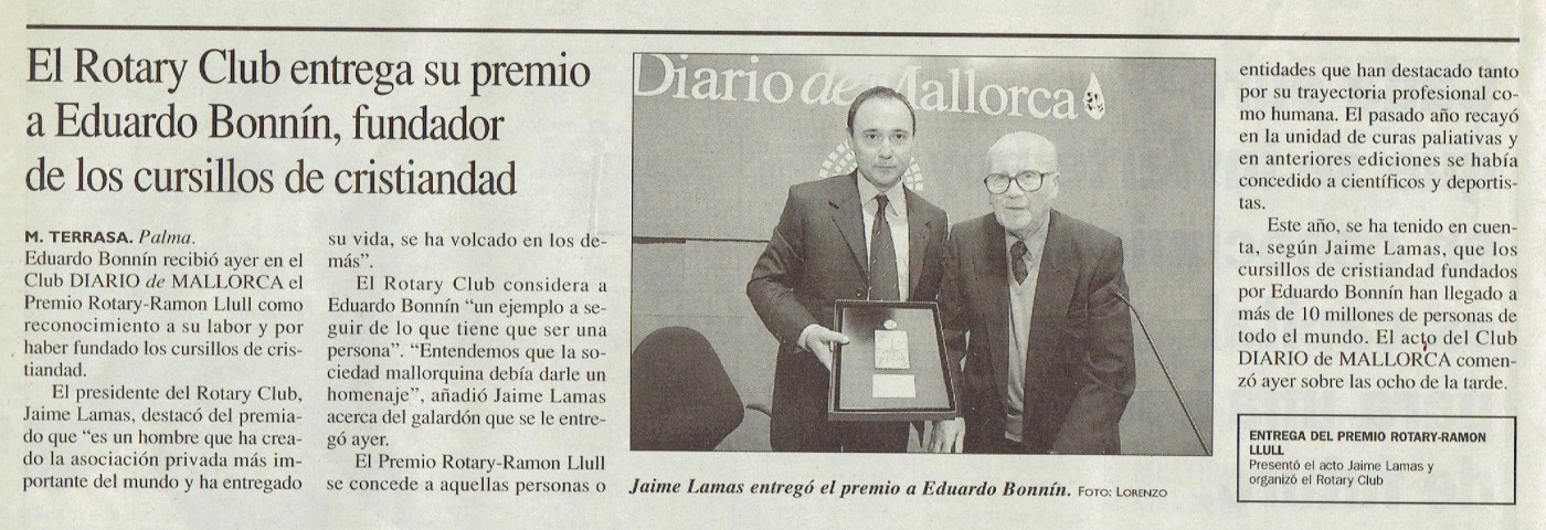 El Rotary Club entrega su premio a Eduardo Bonnín, fundador de los cursillos de cristiandad