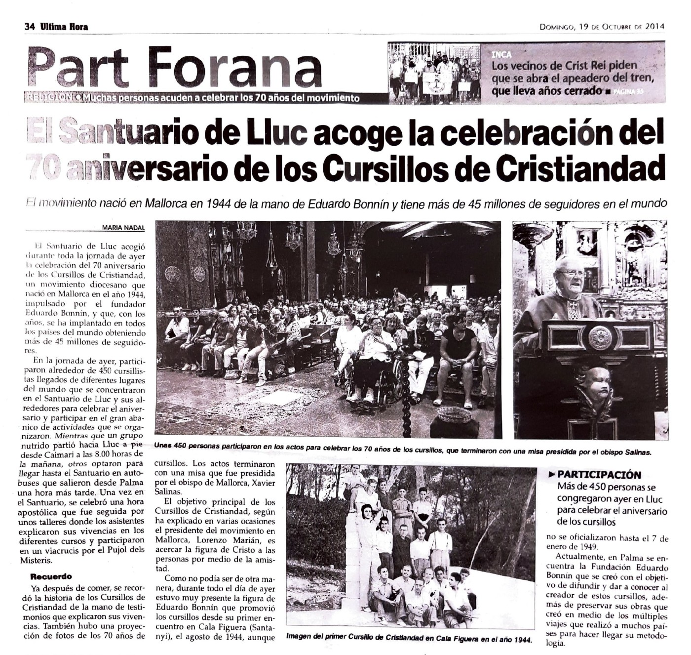El Santuario de Lluc acoge la celebración del 70 aniversario de los Cursillos de Cristiandad