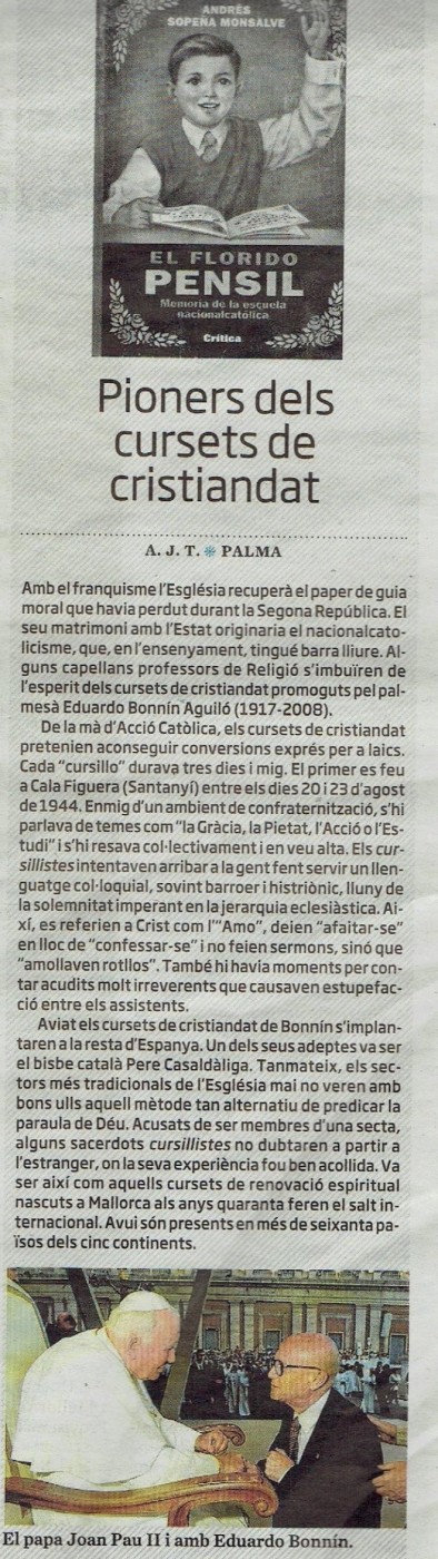 Amb el franquisme l’Església recuperà el paper de guia moral que havia perdut durant la Segona República. El seu matrimoni amb l’Estat originaria el nacionalcatolicisme, que, en l’ensenyament, tingué barra lliure. Alguns capellans professors de Religió s’imbuïren de l’esperit dels cursets de cristiandat promoguts pel palmesà Eduardo Bonnín Aguiló (1917-2008).